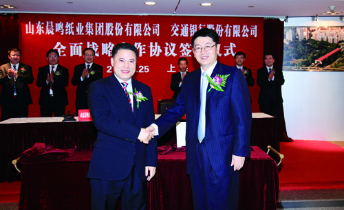9月25日下午,晨鳴集團(tuán)與交通銀行全面戰(zhàn)略合作協(xié)議簽約儀式在上海交通銀行總行隆重舉行。晨鳴集團(tuán)董事長陳洪國、交通銀行行長彭純等出席簽約儀式,晨鳴集團(tuán)財務(wù)總監(jiān)王春方、交通銀行公司業(yè)務(wù)總監(jiān)呂本獻(xiàn)分別在協(xié)議書上簽字。晨鳴集團(tuán)董事長陳洪國與交通銀行副行長錢文揮分別致辭。