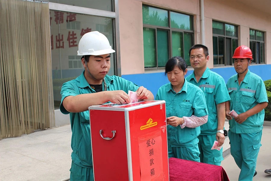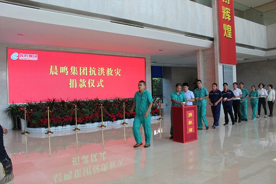 作為壽光市工業(yè)發(fā)展的領頭羊和排頭兵,晨鳴集團甘之如飴,不計得失,在抗災自救的同時,主動承擔社會責任,陸續(xù)組織抗洪救災捐款,發(fā)動全員向災區(qū)捐款獻愛心,全體干部員工也積極響應,踴躍參加。8月27日上午,晨鳴集團辦公樓大廳前,正在排隊等候捐款的干部員工依次走到捐款箱前,鄭重向箱內(nèi)投進凝結(jié)著顆顆晨鳴愛心的捐款。